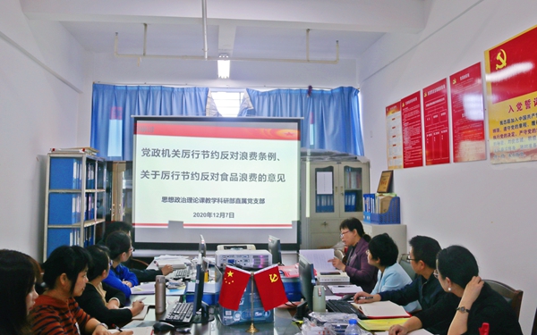 为深入贯彻落实习近平总书记重要指示精神,坚决制止餐饮浪费行为,进一步教育引导教师养成节俭节约的良好行为习惯,2020年12月7日,思政部直属党支部组织全体党员在党员活动室开展《关于厉行节约反对食品浪费的意见》学习研讨会。