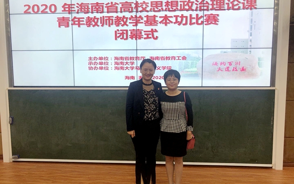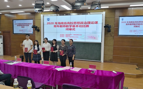2020年11月16日-17日,海南省高校思想政治理论课青年教师教学基本功比赛在海南大学举行。海南省教育工会、海南省教育厅思政处负责人、全省21所高校的43位选手,以及100多名思政课教师参加开幕式。思政部选派思政课教师肖宝佳和吴启凤老师参加比赛,基础课教研室主任陈若团带队参加,思政课教师周丽萍观摩比赛。