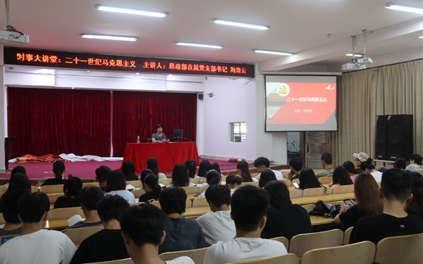 2021年5月7日下午,思政部形势与政策教研室组织的党史学习教育“时事大讲堂”第一期开讲。思想政治理论课教学科研部直属党支部书记周清云在图书馆多功能报告厅作党史学习教育专题讲座——“二十一世纪马克思主义”。20旅游管理(1)、20酒店管理(1)、20酒店管理(二年)、20旅游管理(二年)等班的学生参加讲座。