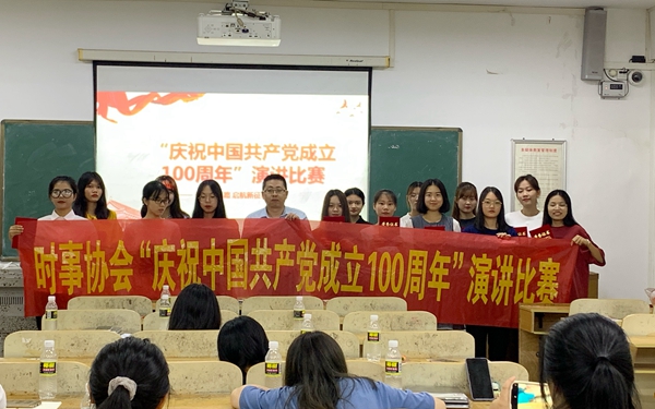 为庆祝中国共产党成立100周年,时事协会于2021年5月28日晚上20:00在多媒体13举行演讲比赛,比赛由协会会长李琪同学主持,协会指导老师周群林担任评委。