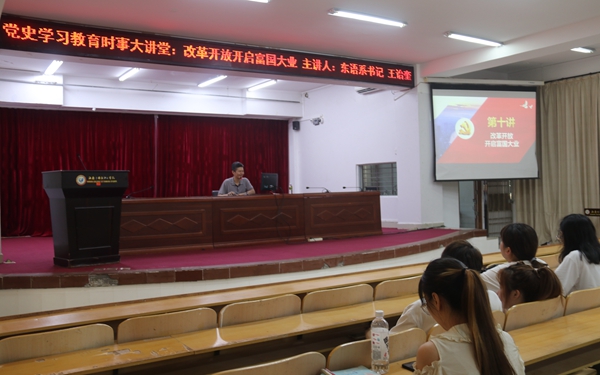 5月21日下午,思政部形势与政策教研室组织的党史学习教育“时事大讲堂”第4期开讲。东语系党总支书记王诒奎在图书馆多功能报告厅作党史学习教育专题讲座——《改革开放开启富国大业》。18应泰(501)、19应韩、19商日(1)等班的学生参加讲座。