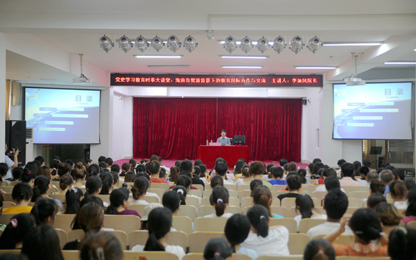 为切实把党史学习教育转化为推动学院深化教育改革开放的不竭动力,在习近平总书记发表“4·13”重要讲话3周年、《海南自由贸易港总体方案》出台1周年、《中华人民共和国海南自由贸易港法》刚刚颁布的利好背景下,6月22日下午,我院党史学习教育专题时事大讲堂第10期在图书馆多功能报告厅顺利开讲,院长李渝凤教授作《海南自贸港背景下的教育国际合作与交流》主题讲座。来自各系部的教师和学生300余人聆听讲学。