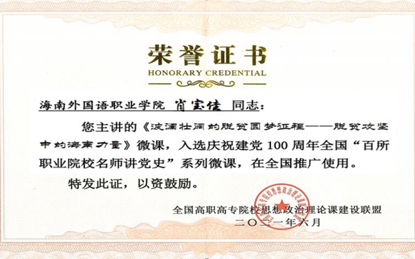 我院作为全国高职高专院校思想政治理论课建设联盟理事单位,学院党委书记佴建乔高度重视此次活动,要求思政部统筹部署。思政部主任周清云协调海南省三所高职院校曾获教学比赛一等奖的五位思政课教学名师参与视频录制,按时按质按量向联盟提交了视频。我院在此次活动中因组织有力,贡献突出,荣获最佳组织奖。