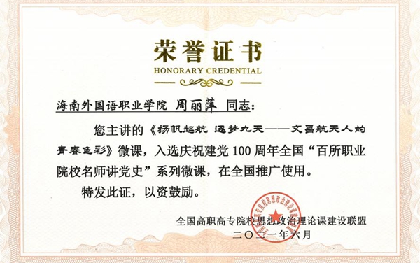 在这次活动中,我院思政部选派周丽萍和肖宝佳两位老师参加视频录制。思政部主任周清云根据活动要求对两位教师进行认真指导,要求思想站位要高,创意设计要好,行动计划要快。视频录制活动过程中,在思政部其他教师的全力辅助配合支持下,两位教师认真准备素材,修改教案,精心设计流程,紧紧围绕党史学习教育主题,抓住文昌和海南的特点,分别录制了《扬帆起航 逐梦九天——文昌航天人的青春色彩》、《波澜壮阔的脱贫圆梦征程——脱贫攻坚种的海南力量》微视频,他们以生动的语言、独特的视角讲好党史故事,展示中国共产党风雨兼程一百年的伟大成就,充分发挥一线思政课教师的育人作用。最终周丽萍和肖宝佳两位思政课教师录制的微视频均入选庆祝建党100周年全国“百所职业院校名师讲党史”系列微课,并在全国推广。