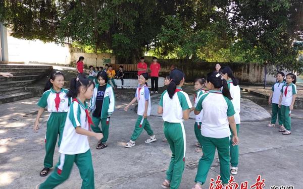 7月30日上午,定安新竹镇祖坡小学内热闹非凡。身穿白绿相间校服的小学生们,在志愿者的引导下玩着户外游戏。他们手牵着手,时而抱团、时而奔跑,发出一阵阵欢呼声。