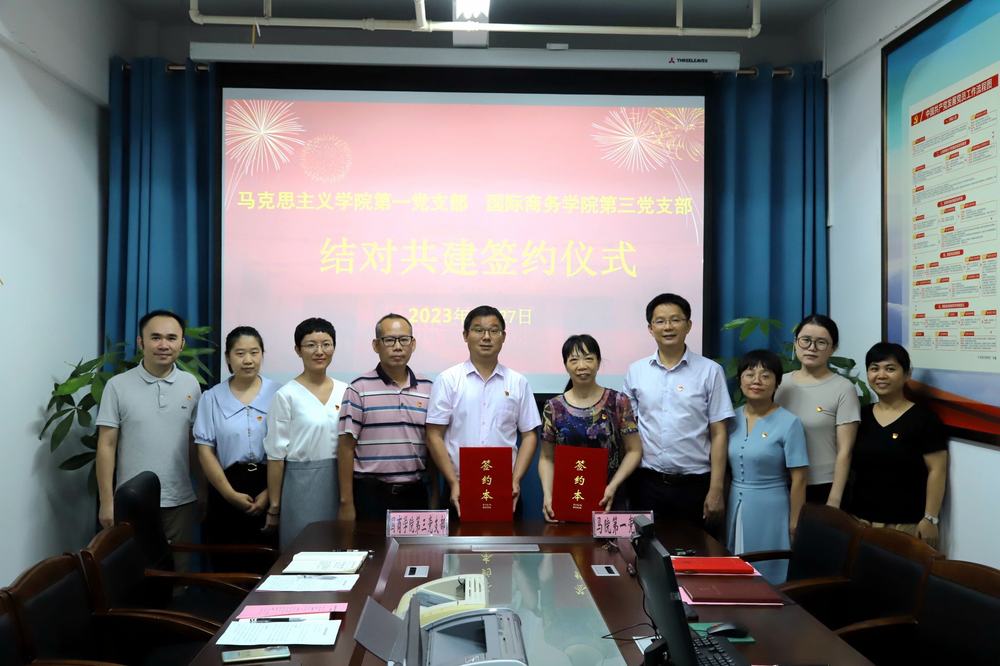 签约仪式由邢益承书记主持,吴东阳书记首先详细介绍了两个党支部结对共建的背景和结对共建工作的主要内容。接着,双方就各自党支部发展与建设、党建工作与教学工作的融合经验,以及下一步的共建模式和共建内容进行了深入交流。最后,马克思主义学院院长、第一党支部书记周清云和国际商务学院第三党支部书记黄华签署结对共建协议。