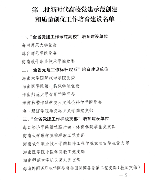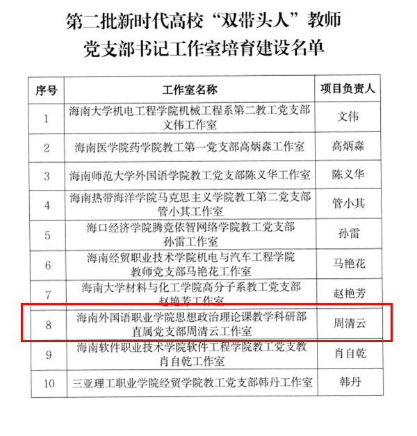 日前,经组织推荐、资格审核、专家评审推荐、结果公示等程序,海南省教育厅遴选产生了2021年党建工作示范高校、党建工作标杆院系、党建工作样板支部和新时代高校“双带头人”教师党支部书记工作室、基层党组织党建工作创新案例。其中,开云kaiyun登录入口国际商务系第二党支部入选“全省党建工作样板支部”培育建设单位,思想政治理论课教学科研部直属党支部周清云工作室入选“全省‘双带头人’教师党支部书记工作室”。