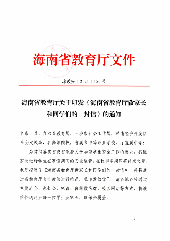 转:海南省教育厅关于印发《海南省教育厅致家长和同学们的一封信》的通知