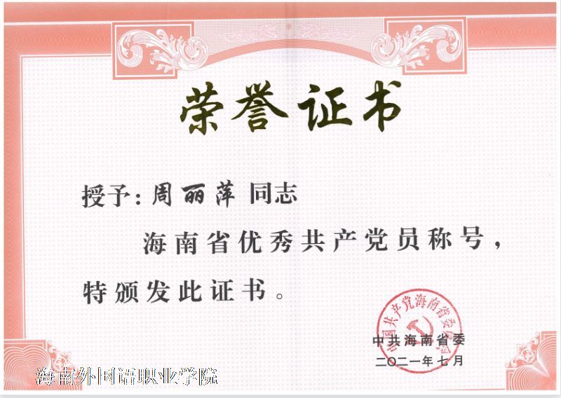 周丽萍老师荣获海南省优秀共产党员称号