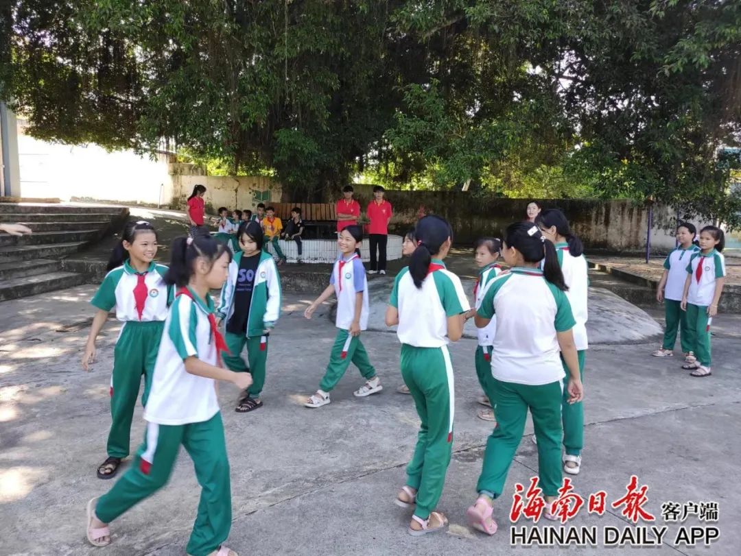 7月30日上午,定安新竹镇祖坡小学内热闹非凡。身穿白绿相间校服的小学生们,在志愿者的引导下玩着户外游戏。他们手牵着手,时而抱团、时而奔跑,发出一阵阵欢呼声。