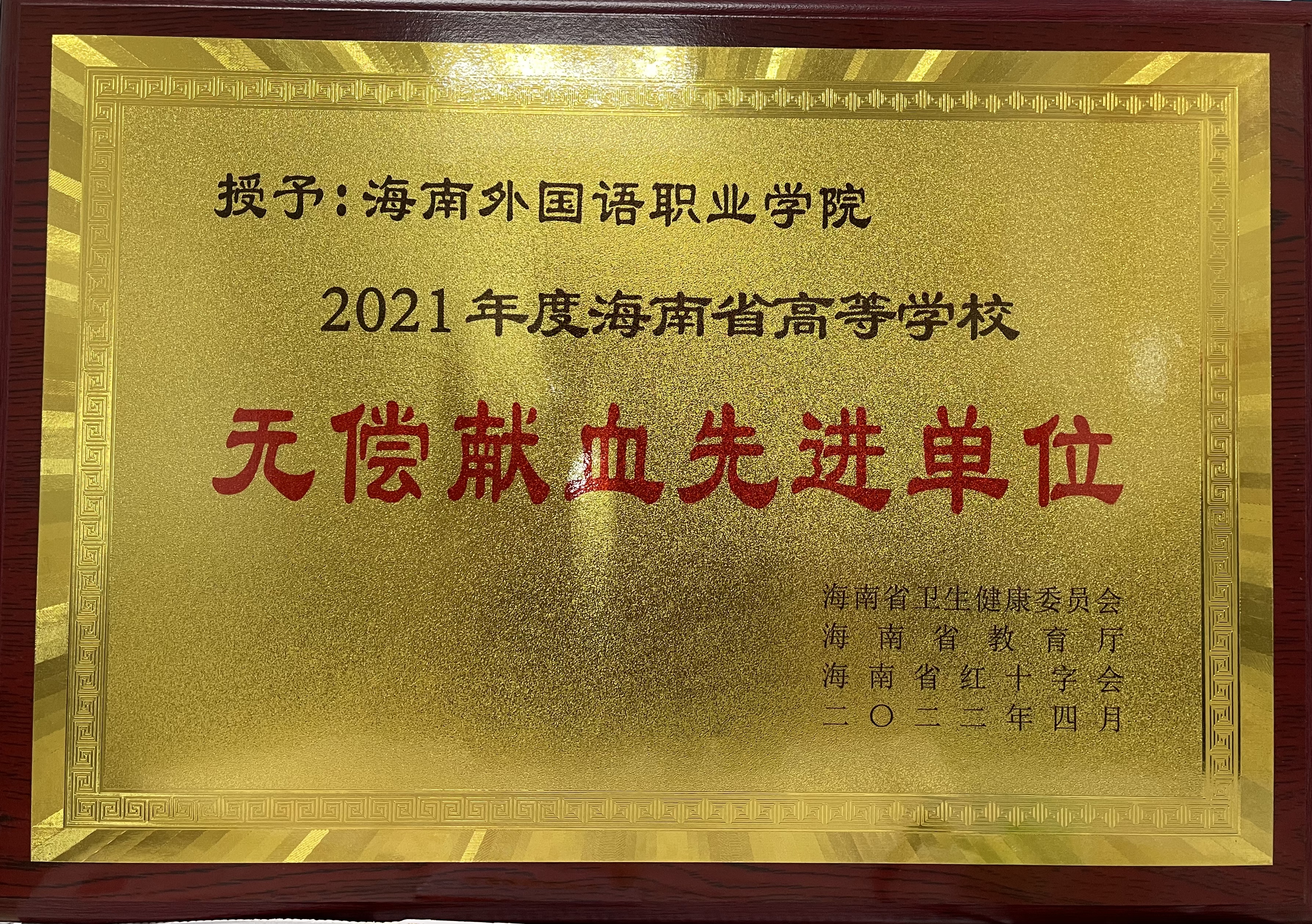我院荣获2021年度海南省高等学校无偿献血先进单位奖