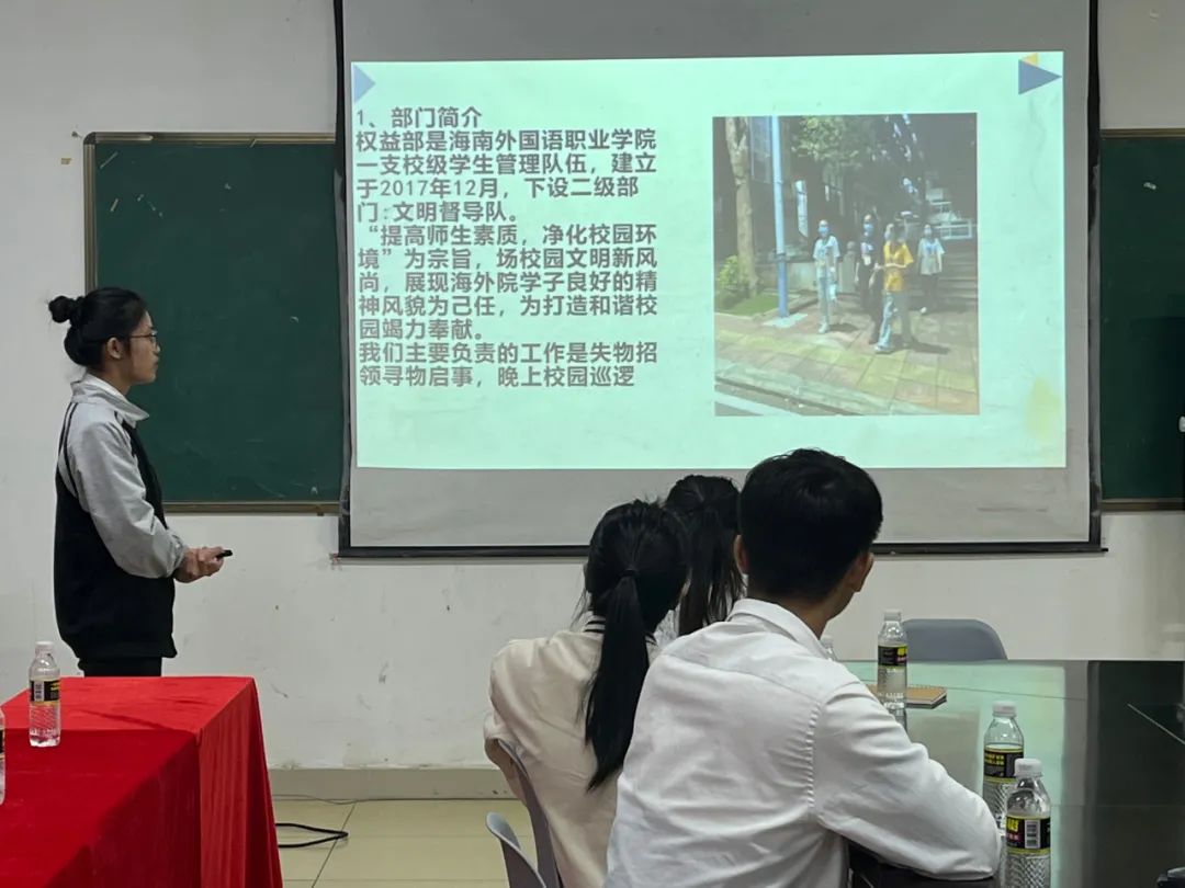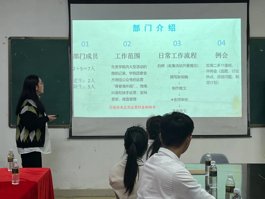 最后,团委韩琪老师对本学年度团学工作给予充分肯定,并提出三点要求:一、各部门应充分熟悉本部门工作情况,做到知根知底。二、部门之间要加强沟通协作、凝心聚力,协同联动推进工作任务落实。三、明确干部职责,规范工作作风。