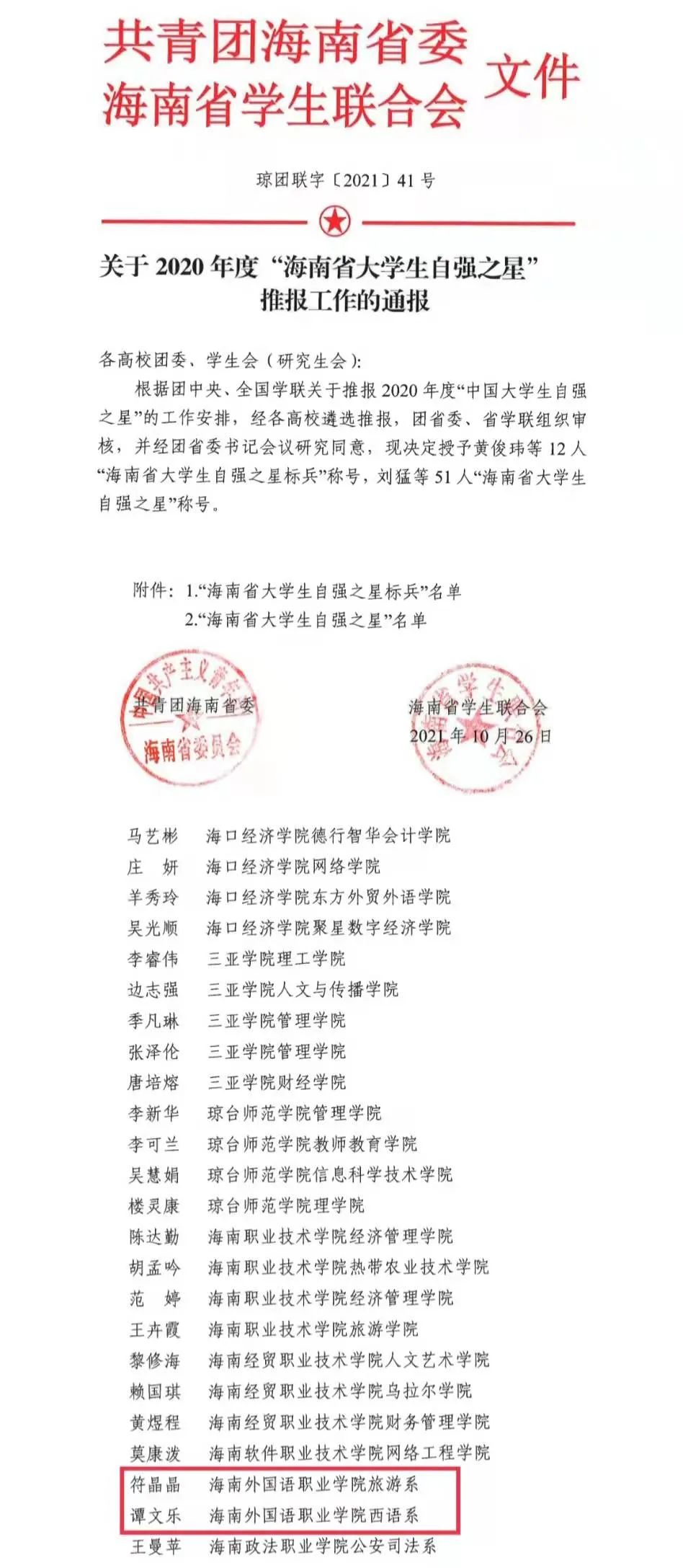 近日,由共青团海南省委、海南省学生联合会发布的2020年度“海南省大学生自强之星”结果通报中,我院西语系2019级应用意大利语班谭文乐及旅游系2019级酒店管理(501)班符晶晶荣获“海南省大学生自强之星”称号。