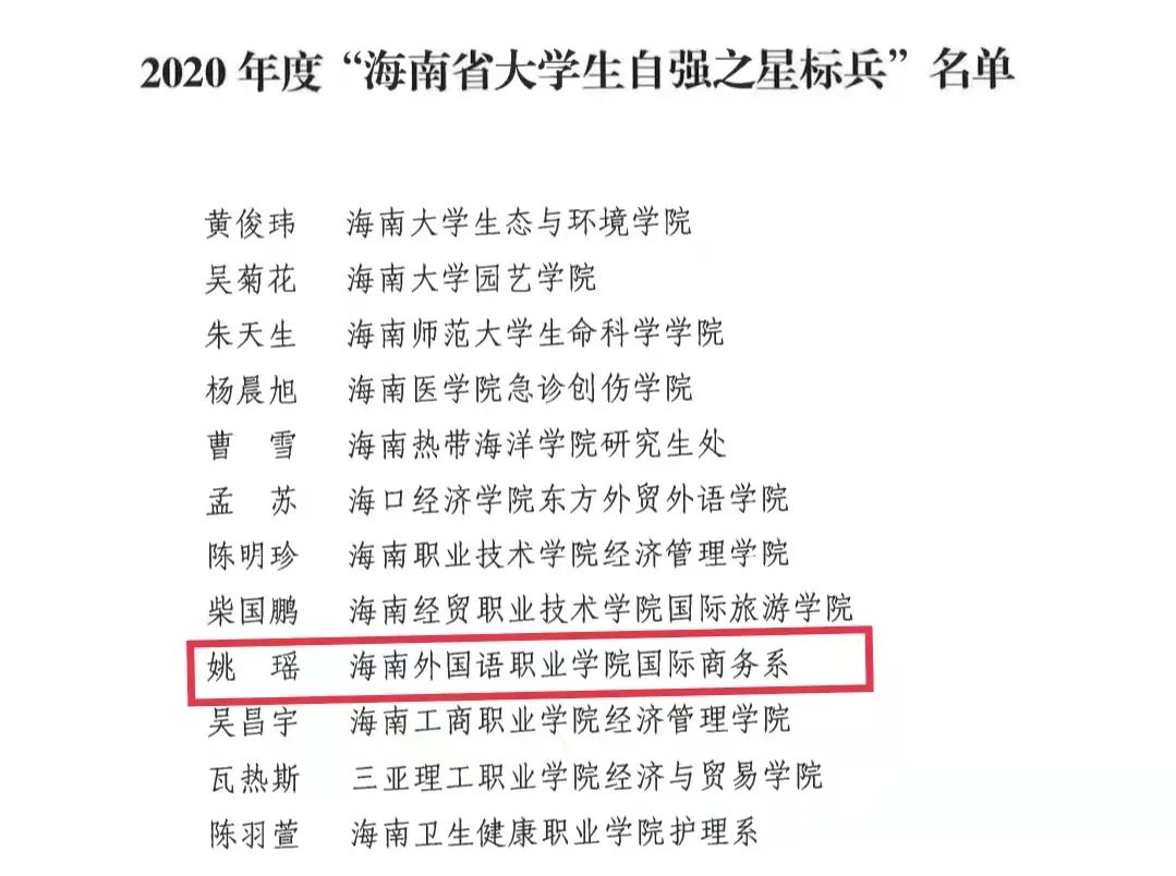 近日,由共青团中央、全国学联指导,中国青年报社、新东方教育科技集团联合开展的2020年度“中国大学生自强之星”评选结果揭晓,经学校推荐、省级初评、全国评审等环节,我院国际商务系2018级商务英语(2)班姚瑶同学获2020年度“中国大学生自强之星”奖学金、海南省“大学生自强之星标兵”称号。