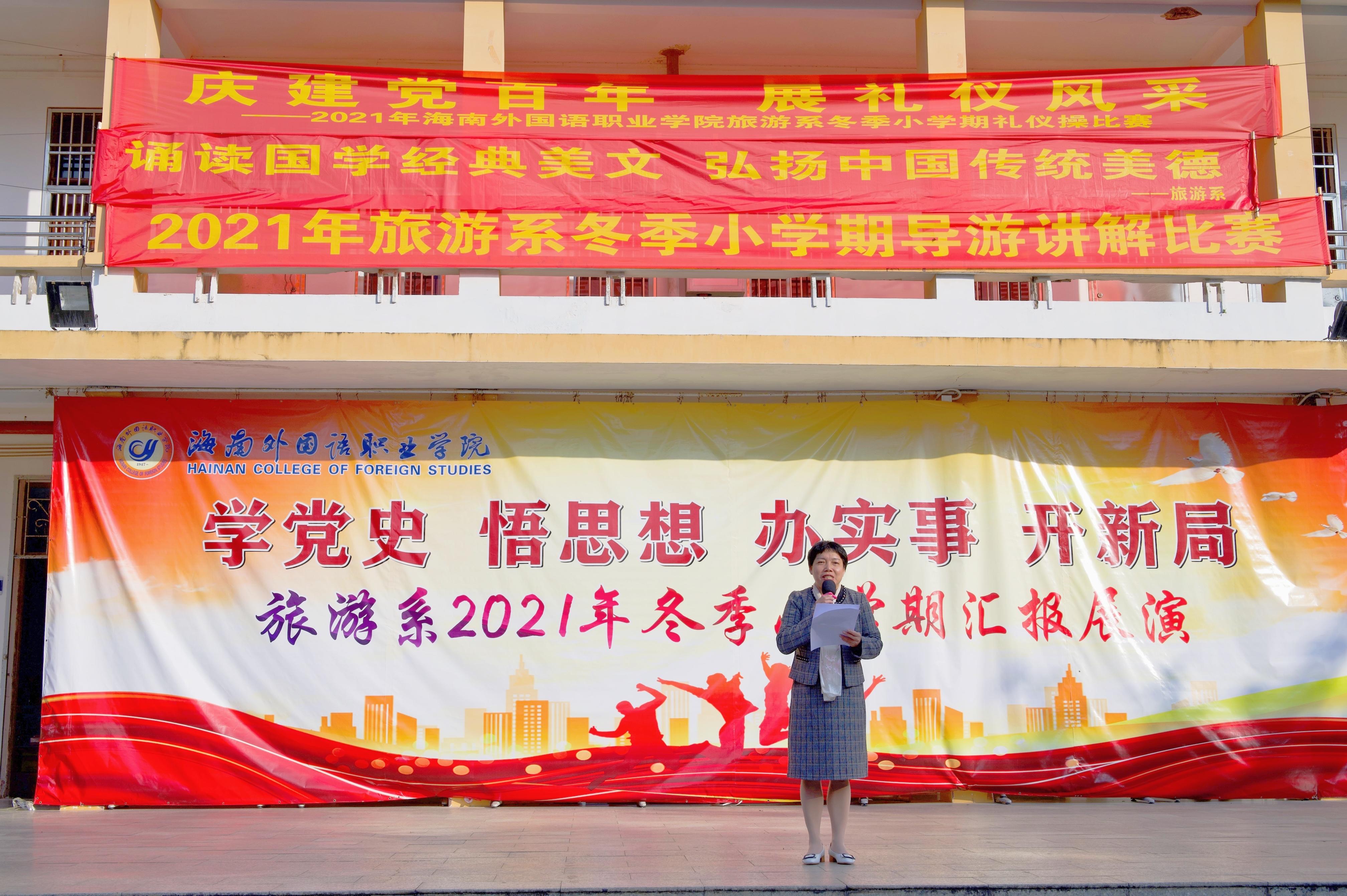 汇演开始之前,旅游系党总支林明霞书记为本次活动进行致词,林明霞书记对本年度我系为期两周的冬季小学期工作进行了总结,对学生们两周来的表现进行了点评,也为系部和学院发展寄予美好祝愿。
