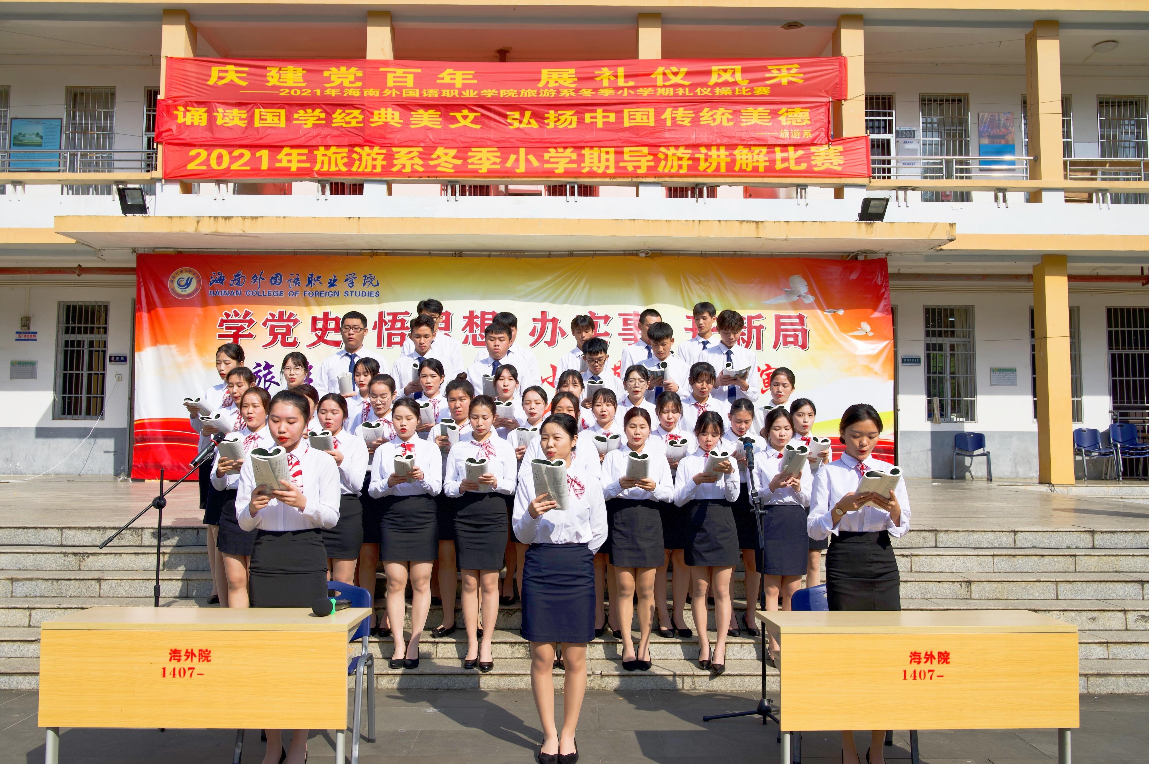 本次汇演节目有礼仪操、导游讲解、中外文歌曲、酒店技能大赛(折花)以及国学诵读五个部分组成。
