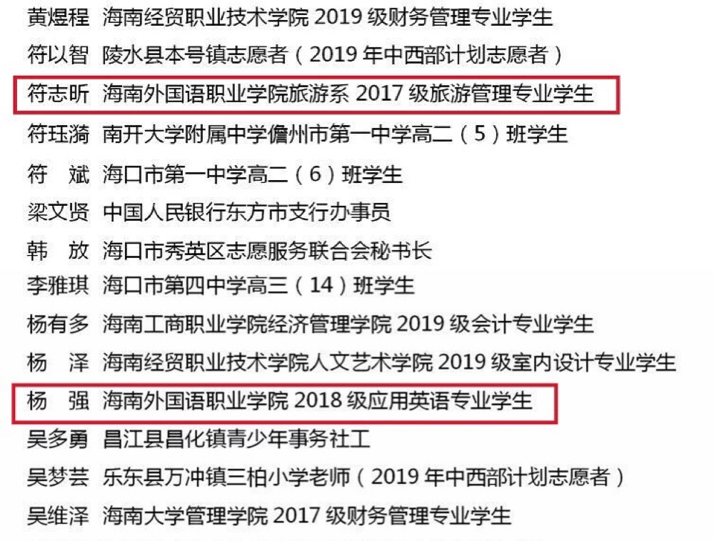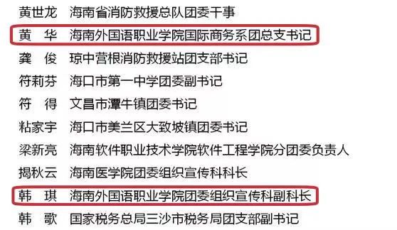 近日,在五四青年节到来之际,团省委表彰了一批在海南省共青团工作中的先进青年集体和个人。授予我院旅游系2017级旅游管理(502)班团支部、西语系2019级应用俄语班团支部“海南省五四红旗团支部”称号;授予我院团委教师韩琪、国际商务系团总支书记黄华“海南省优秀共青团干部”称号;授予旅游系2017级旅游管理(502)班符志昕、英语系2018级应用英语翻译(3)班杨强“海南省优秀共青团员”称号。