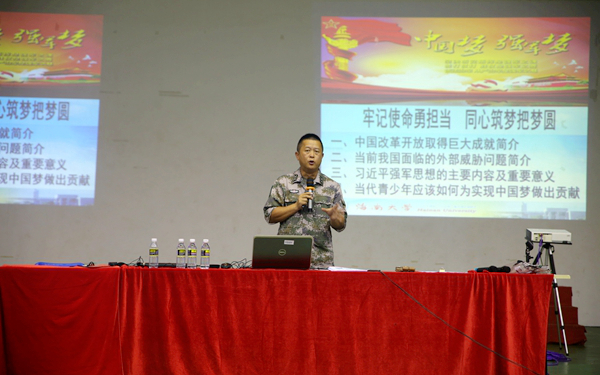 在讲座中,黄海宁用自己热情激昂、通俗易懂的语言为新生们详细解读了当前的国际形势,介绍了我国目前的四大问题:中美贸易、台湾问题、港独和我国的海洋权益问题。他指出,国防安全是维系国家安全的重要力量,关乎每一个人,而当代大学生又是国防后备军的重要组成部分,也是国防安全最重要的力量,必须树立强烈的国防意识。大学生必须要树立亮剑精神,做好一切维护我国国土安全的准备,学习贯彻落实习近平总书记总体国家安全观,清醒认识我国国家安全面临的形势,严守底线,勇于担当,立足学习,主动参与“中国梦”的伟大进程。