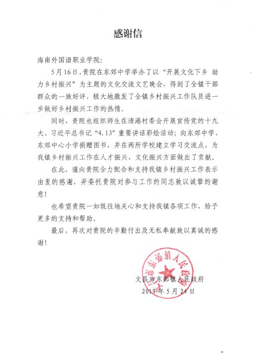5月24日,文昌市东郊镇人民政府给我院发来感谢信,感谢我院在为该镇乡村振兴工作所做的各方面工作。感谢信全文如下: