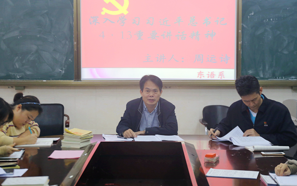12月13日下午,我院周运诗副院长在东语系作专题党课,畅谈深入学习习近平总书记“4.13”重要讲话和中央12号文件精神的认识心得。东语系党总支主要负责人王诒奎主持党课。东语系全体党员、预备党员到场听讲。