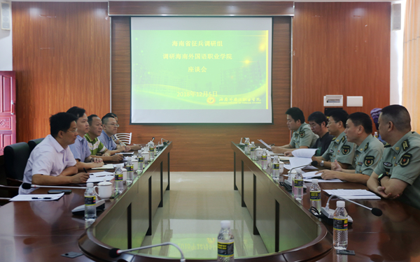 12月5日,海南省征兵调研组领导省军区动员局副局长程佑祥、海南国防杂志社长孙永库、省军区动员局组长刘群、省军区动员局参谋林木养以及文昌市委常委、文昌市人民武装部部长董宁海一行人莅临我院调研征兵工作。我院杨学前副院长、学院办公室主要负责人邢益承、学生处负责人符兴宝等接待调研组领导一行。双方在综合楼7楼第二会议室就征兵工作开展座谈交流。此次座谈,我院也邀请了多位退役大学生参加座谈并发表服役体会和有关建议。