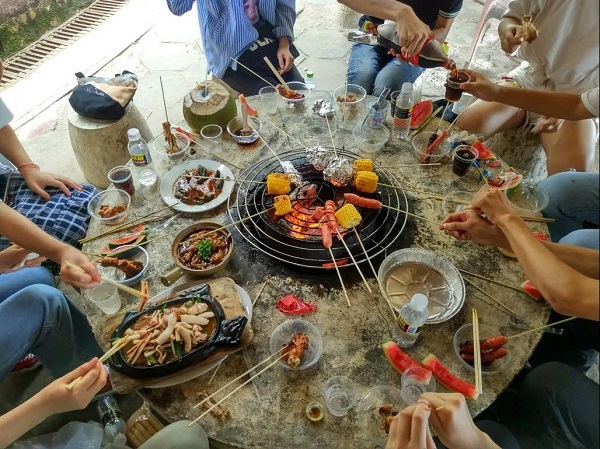 游戏结束后进入的是大家期待已久的烧烤环节,同学们纷纷展示经验十足的烧烤技能,有的准备食材串签,有的准备秘制酱料,分工明确、有条不紊,现场一片和谐,飘满诱人香味。