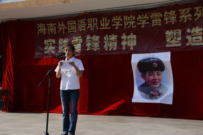2012年3月5日(记者联合会 李玉婷讯) 下午四点二十分在海南外国语职院一号教学楼举行了 “向雷锋同志学习”的系列活动启动仪式。党委书记袁陵南在启动仪式上发表重要讲话,激励广大共青团员深入地学习雷锋精神,传承并发扬下去,号召同学们以雷锋为榜样,不断地总结自我,服务他人。紧接着,由学生代表 09级(1)班的陈亚娟代表全体学生发表讲话,并表示将积极响应团委号召,用实际行动来践行雷锋精神,真正做到繁荣校园文化生活,提高自身素质的作用,努力成为新时代下的活雷锋。