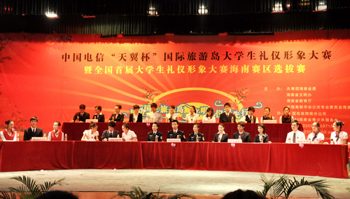 记者联合会10月30日讯 (记者宋炳洲) 10月29日下午6点30分,以“建功国际旅游岛,文明礼仪我先行”为主题的“中国电信天翼杯”国际旅游岛大学生礼仪形象大赛暨全国首届大学生礼仪形象大赛海南赛区复赛在海南师范大学逸夫音乐厅落下帷幕。来自全省的17所高校代表队参加了本次复赛。由于比赛队伍众多,分为上下两个半区进行,最终由我院团委和旅游外语系共同选送的代表队在下半区的比赛中,脱颖而出,取得了总成绩第一的佳绩,顺利挺进总决赛。赛后据本次大赛相关负责人介绍说此次大赛的目的在于加强社会主义核心价值体系建设,塑造“讲文明、重礼仪、诚信友爱、热情好客”的良好形象,形成与“国际化程度高、生态环境优美、文化魅力独特、社会文明祥和”的现代旅游标准相适应的国际旅游岛人文环境。本次大赛由由共青团海南省委、海南省文明办、海南省教育厅、中国高教学会公关专业委员会海南分会联合主办,希望通过本次大赛能够普及文明礼仪知识,展示窗口礼仪文化、礼仪修养、服务礼仪、社交礼仪、中华传统礼仪、民族民俗礼仪、生态礼仪和国际礼仪等优质服务风采,以点带面,促进行风政风建设,改善投资环境、服务环境,为国际旅游岛建设营造良好的社会环境。最后也预祝我院代表队能够在最后决赛中再接再厉,取得优异成绩。