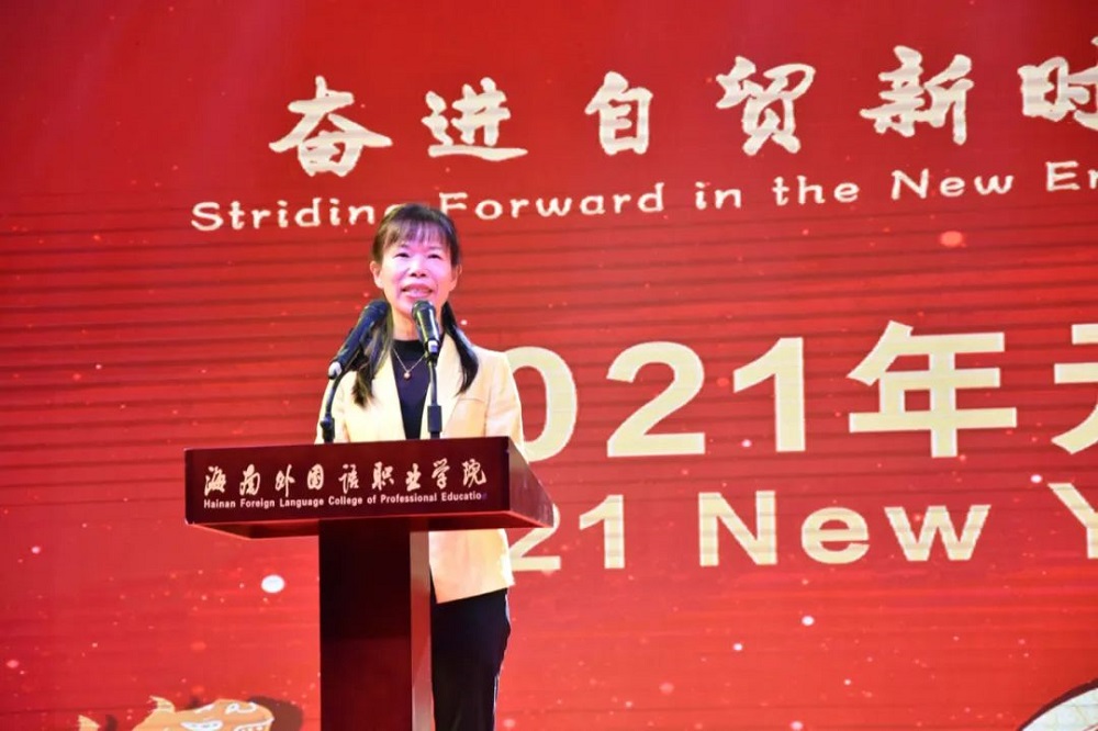 学院党委副书记黄丽芹代表学院上台致新年贺词。黄丽芹副书记肯定了2020年学院所取得的成果以及展望2021年,并对全体师生送出美好的祝福。