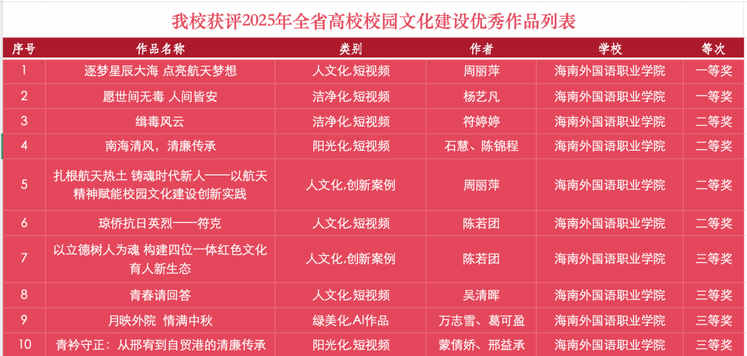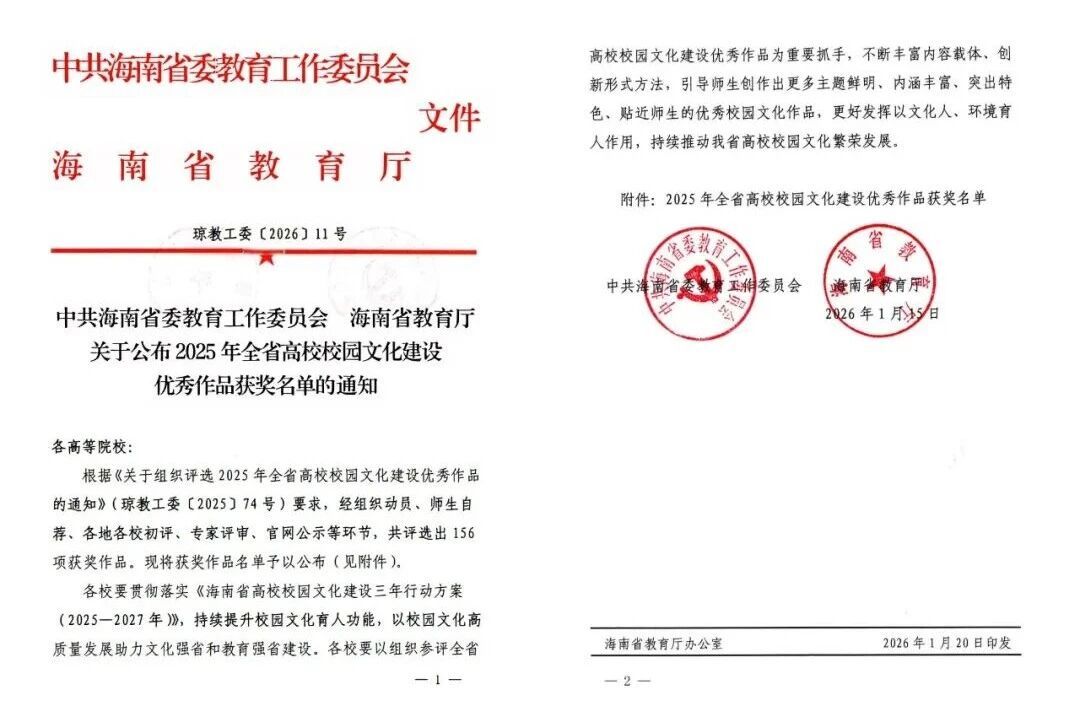 近日,中共海南省委教育工作委员会、海南省教育厅公布了2025年全省高校校园文化建设优秀作品获奖名单。开云官网在本次评选中表现亮眼,10个作品脱颖而出,荣获一等奖2项、二等奖4项、三等奖4项,充分展现了学校校园文化建设和立德树人工作的良好成效。