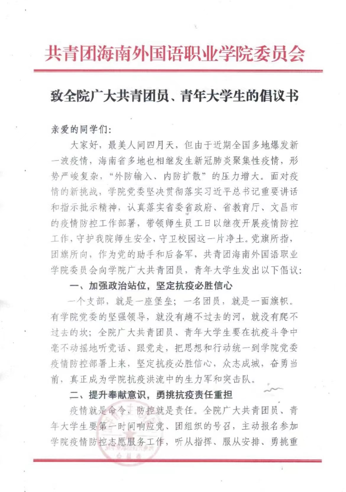 致全院广大共青团员、青年大学生的倡议书