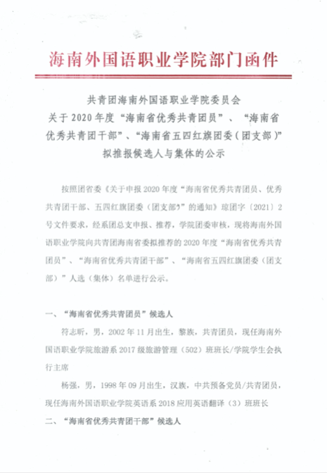 关于2020年度“海南省优秀共青团员”、“海南省优秀共青团干部”、“海南省五四红旗团委(团支部)”拟推报候选人与集体的公示
