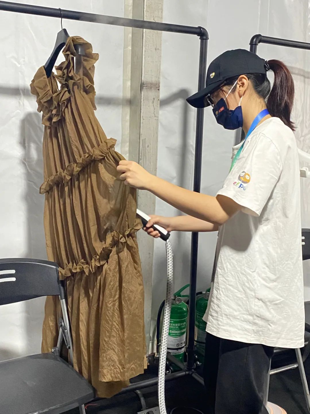 后台服装组志愿者魏彤彤同学,负责协助编导与设计师帮忙给模特穿着、熨烫、整理服装以及衣物装箱撤场等工作。她说:“通过这几天的工作,了解到很多时尚设计和服装搭配知识,大到衣服版型设计,小到服装针脚修改与熨烫,感受最深的是一场光鲜亮丽的台前表演,离不开无数导演、设计师、模特、造型师以及志愿者在幕后的共同努力。”