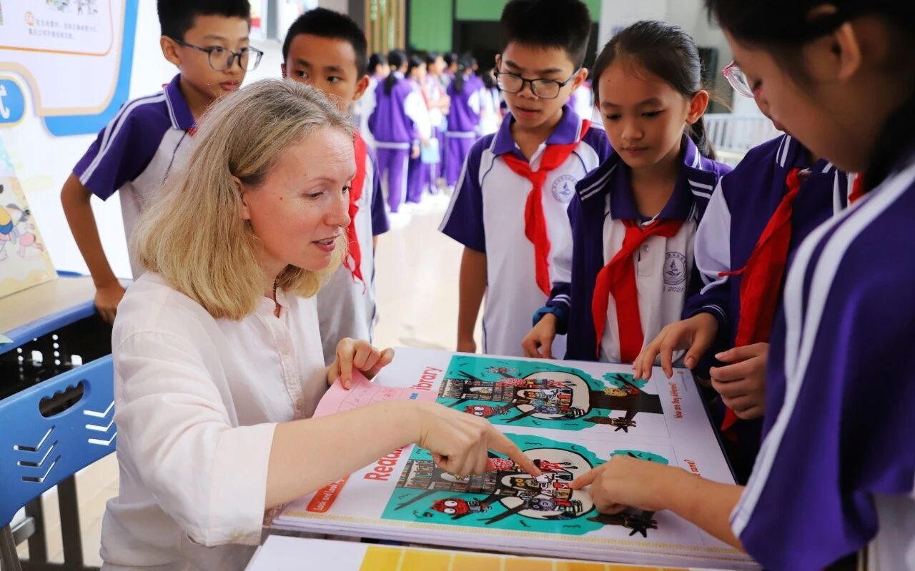 “Hello! What's your favorite color?”在海口市滨海第九小学琼中附属实验学校的操场上,来自开云官网俄罗斯的外教EVGENIIA OLEINIKOVA正弯腰与学生们对视交流,她温柔的语气、夸张的手势搭配灿烂的笑容,让围在身边的孩子们渐渐放下羞涩,尝试用稚嫩的英语回应。