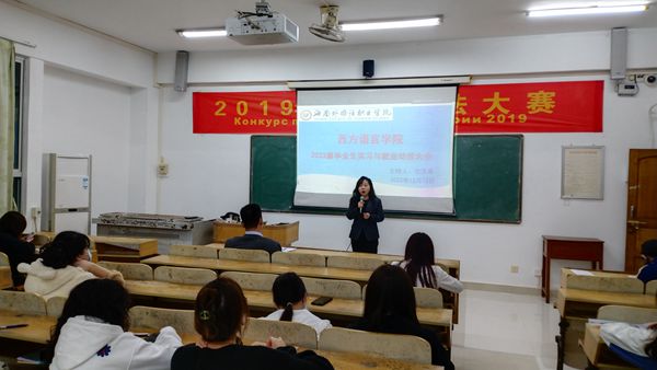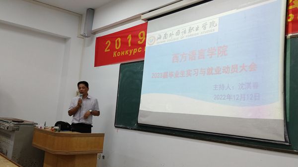 20221212日晚8点,西方语言学院多媒体14教室召开2023届毕业生实习就业(线上线下)动员大会。