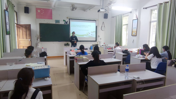 首先,外教向学生介绍足球的起源和世界杯的相关知识,1928年世界杯在法国创立,迄今为止有8个国家获得过世界冠军,分别是:巴西、德国、意大利、乌拉圭、阿根廷、法国、英国和西班牙。同时,阐述了足球在葡语国家中的重要地位,最后向学生展示了葡语国家的足球明星。大家都听得津津有味,与外教进行互动,并表示通过本次讲座,了解到了葡语国家的足球文化,都希望以后能多多举办类似的文化讲座。