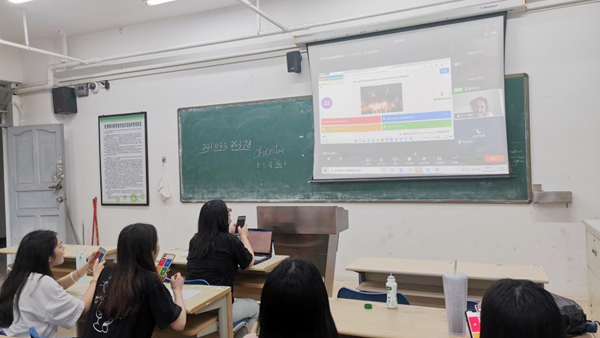 外教露西娅语言亲和幽默,师生间的线上互动贯穿讲座始终。为了加强互动,露西娅精心设计并在讲座环节中加入了教育游戏化平台kahoot的运用,为在座的同学们创建了一个有趣的学习空间。活动现场,学生们使用手边的电子设备积极参与游戏和互动,抢答有关西班牙节日的各种题目,青春洋溢的脸上满是认真和喜悦。