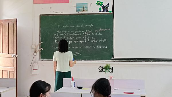 为了拓展学生的专业知识面,增强学生的写作能力,20应用葡萄牙语班开展了“葡语故事之句子连连看”的课内游戏实践活动。游戏开始前,专业教师介绍了游戏规则,之后进入实践活动的准备环节,大家依次在黑板写下自己的句子。上台的每位同学都仔细观察黑板上已有的句子,并对自己完成的句子进行连接和修改,一句接一句,最后连成一篇小短文,由专业老师进行语法修改和错误订正,之后大家一同阅读和学习了短文。