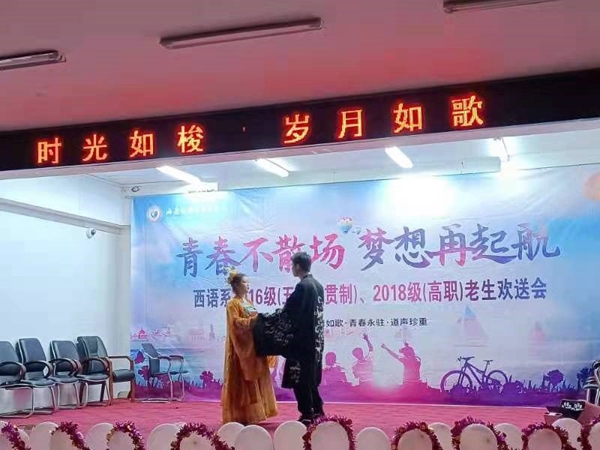 为表达对2016级(五年一贯制)、2018级(高职)学长学姐们长期以来在学习、生活及工作上对学弟学妹们的照顾与帮助,表示衷心的感谢及为她们送上美好祝福,让她们记住我们(西语系)集体的温暖,给他们在离校之前留一个美好的回忆,西语系新老生共聚一堂,举办了2020年老生欢送会。