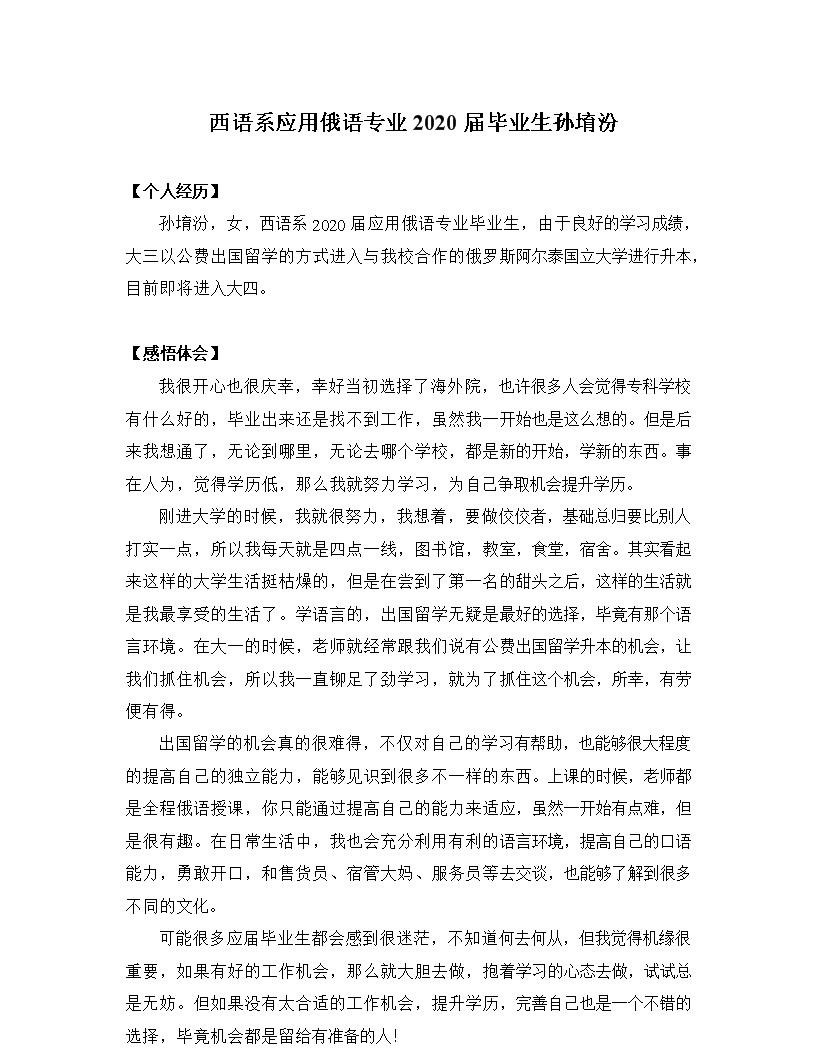 【国外留学事迹】西语系应用俄语专业2020届毕业生孙堉汾