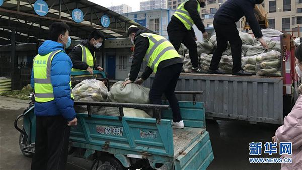 萝卜运抵郑州后,志愿者帮助卸车(2月5日摄)。新华社发