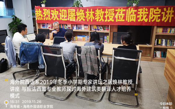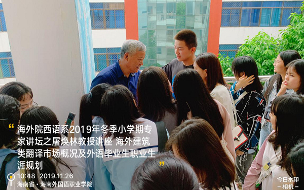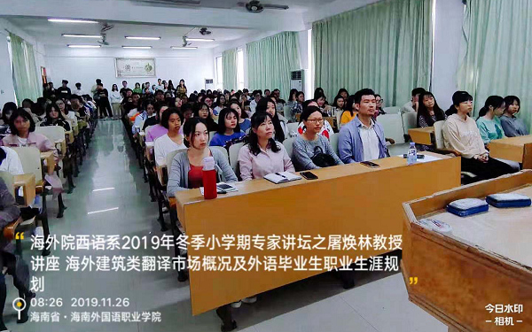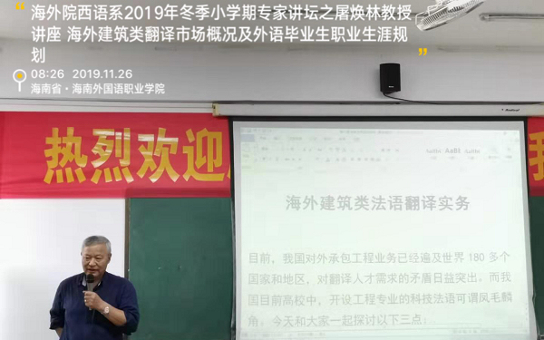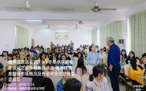 2019年11月26日(星期二)上午8:00,浙江省建设投资集团资深法语翻译屠焕林教授在多媒体14教室为开云kaiyun登录入口西语系应法、应西和应葡专业师生作了题为“海外建筑类翻译市场概况及外语毕业生职业生涯规划”的讲座。