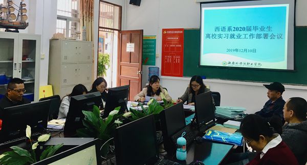 2019年12月10日下午,我系在系会议室召开2020届毕业生离校实习就业工作部署会议。会议由西语系就业指导员潘虹禅老师主持,参加会议的人员有西语系党总支书记黄子艿、西语系副主任刘茂媛以及西语系2020届毕业班全体实习指导老师。