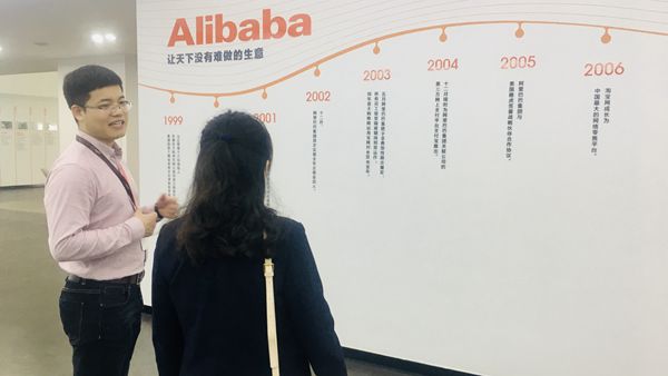 到达海口复兴城后,刘茂媛副主任和潘虹禅老师通过阿里巴巴访客ID进入阿里中心,接着在阿里巴巴云桂区域合伙人李易寒总经理的陪同下参观了阿里中心,了解阿里中心里面阿里集团企业文化的各种元素。在阿里中心进门右手边就有一面长长地展示阿里巴巴集团发展史的文化墙,墙上在阿里醒目的logo下面展示着这么一句话——“让天下没有难做的生意”,这正是阿里的企业使命。