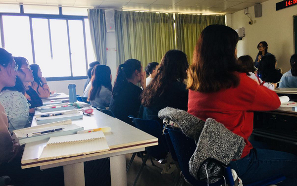 我们第一堂课是洪雯老师的基础法语课程,洪老师课前贴心的安排我们的学生和班级同学岔开坐,便于尽快融入课堂进行互动。我们注意到洪老师非常有耐心,会一步一步引导基础较弱的同学,课堂上注重学生的自主思考能力,课堂气氛非常活跃,师生间的互动也十分有趣,学生们的词汇量很丰富。