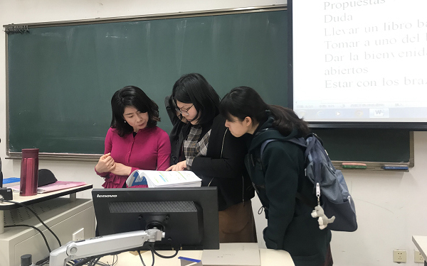 外教课堂让我们感受到不一样的氛围,贴心的外教 Irene将我们的学生安排到了不同小组,尽管都是大一的学生,掌握的时态和词汇还比较有限,但丝毫不妨碍大家交流的热情。每个人都很努力地用西班牙语来表达,认真进行老师布置的对话任务,学习氛围十分浓厚。