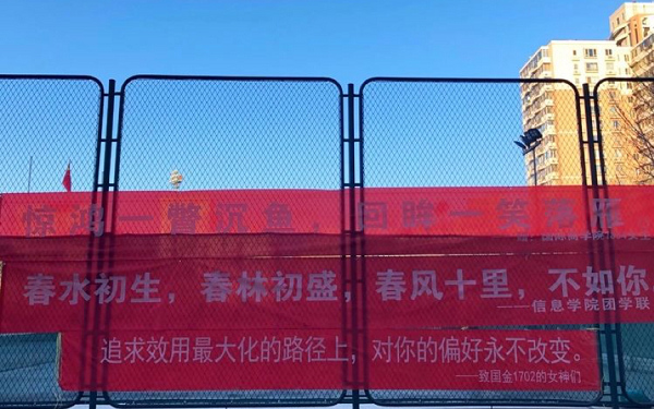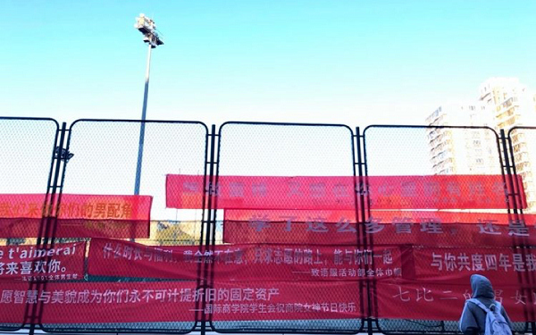 3月14日,恰逢贸大的“女生节”,这一天学校的男生们纷纷挂出了具有贸大特色的横幅,顿时惠园变成了红色的海洋,校园里洋溢着青春活泼的气息。