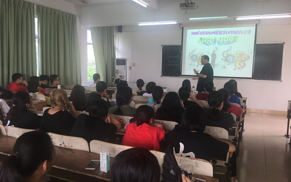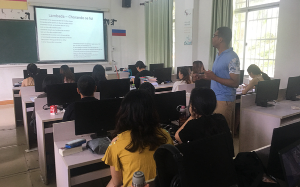葡语外教约拿单和西语外教不约而同选择音乐为主题,这次他给本专业学生带来的讲座题目为“普与国家音乐”。在讲座过程中,他不时与在场学生进行有趣互动。在欣赏音乐时,他不禁随着乐曲忘情歌唱,引得教室里掌声连连。