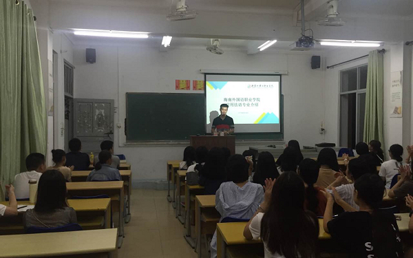专业介绍会由应用法语教研室主任林师茂老师主持,周昱老师和法语外教塞巴斯蒂安也到场与同学们见面。首先由林师茂老师从应用法语专业基本情况、专业开设课程、学生专业活动、法语考试与证书、校企合作和国际合作、学院各项奖学金、毕业生就业情况、选择学法语的八大理由和如何学好法语等八个方面向应法专业的新生们做了详细而具体的介绍。