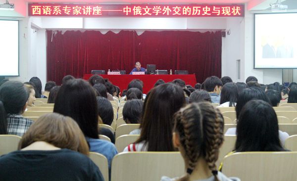 1月12日晚8点,著名俄语文学翻译家、中国俄罗斯文学研究会会长刘文飞教授来我系以“中俄文学外交的历史与现状”为题进行了专题讲座,此次讲座在多功能报告厅开展,我系刘茂媛主任为主持人,我系党总支书记李南群、团总支书记顾大育、学生科科长莫少金及全体师生共同参加。